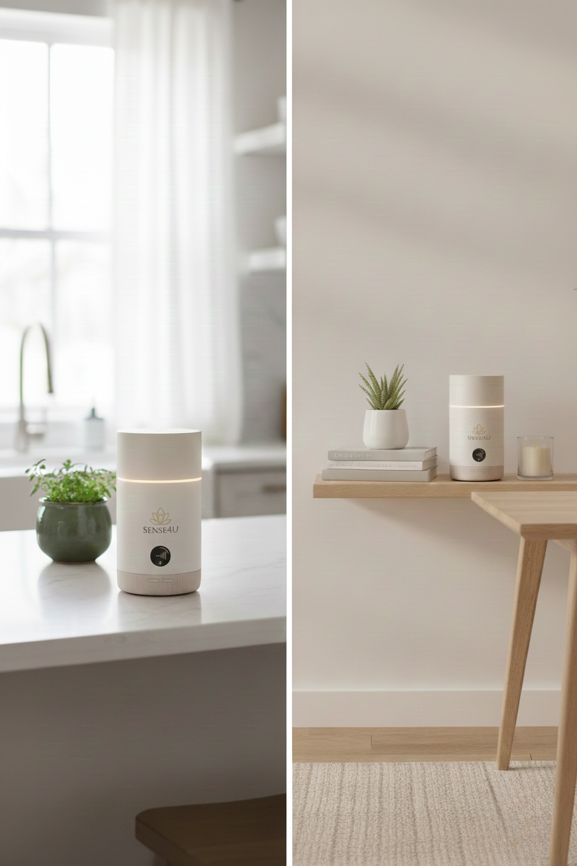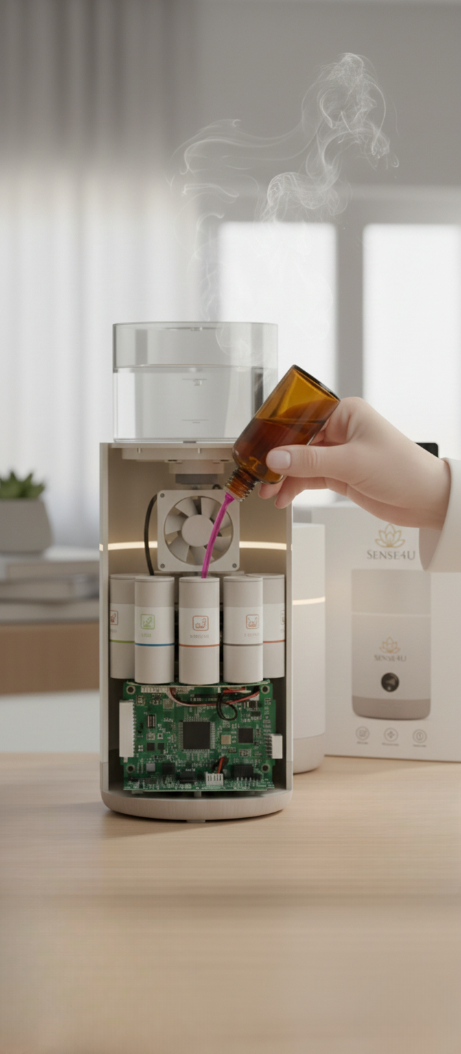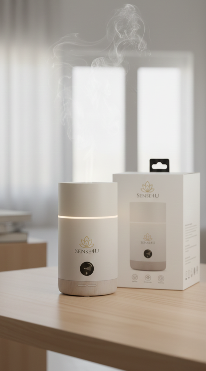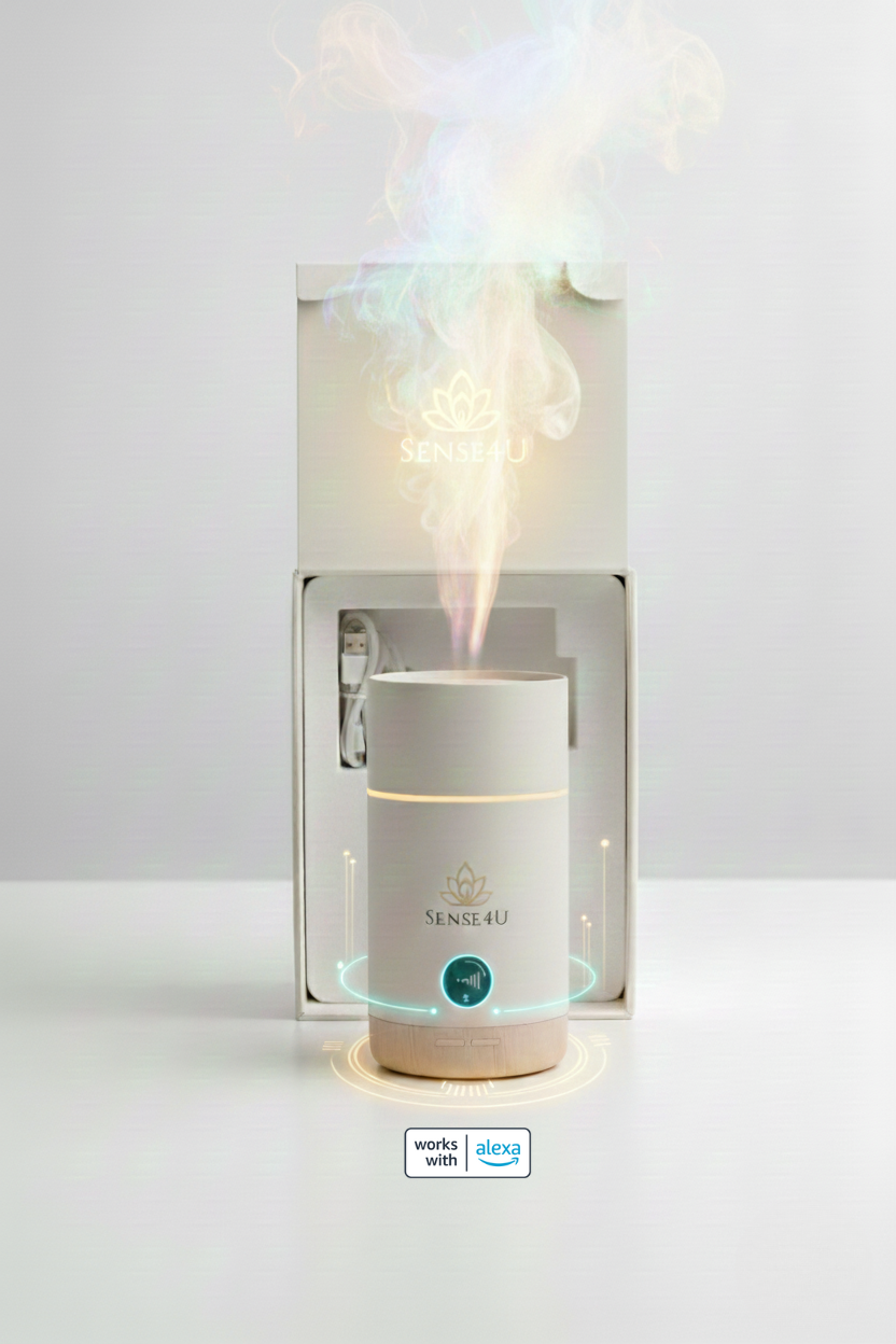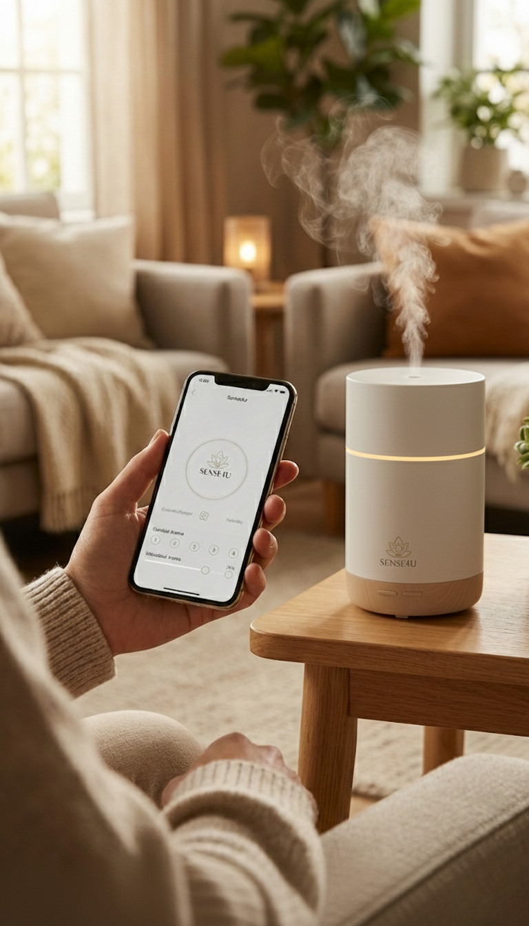 Olvídate de los ambientadores manuales de siempre. Sense4U es la evolución del bienestar en casa: un difusor inteligente conectado a tu móvil para diseñar la atmósfera perfecta en segundos, estés donde estés.